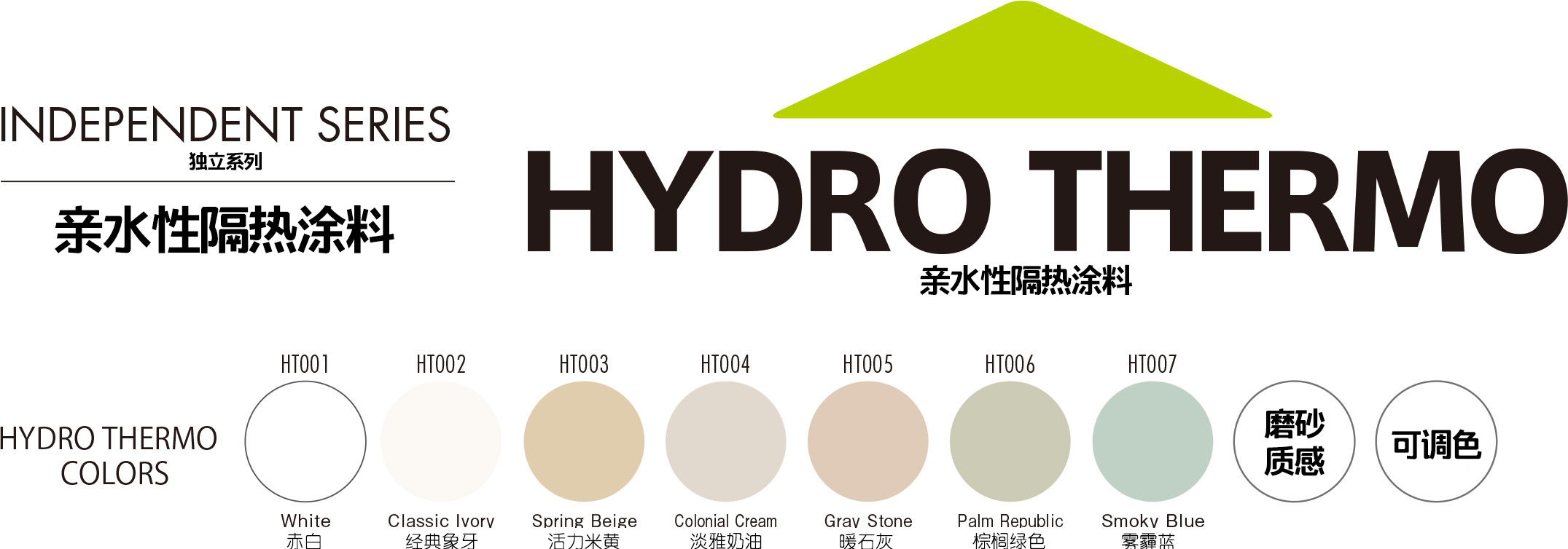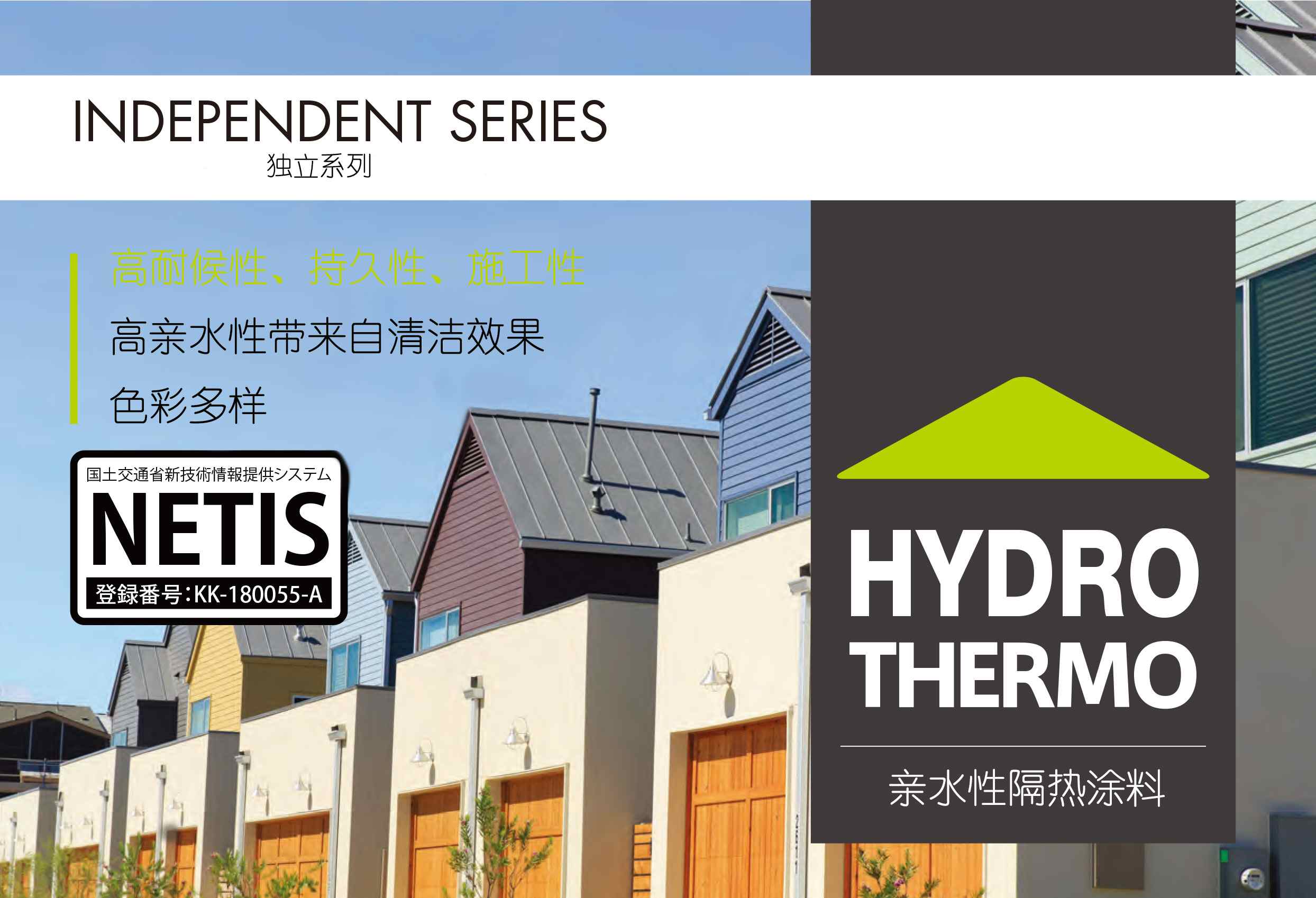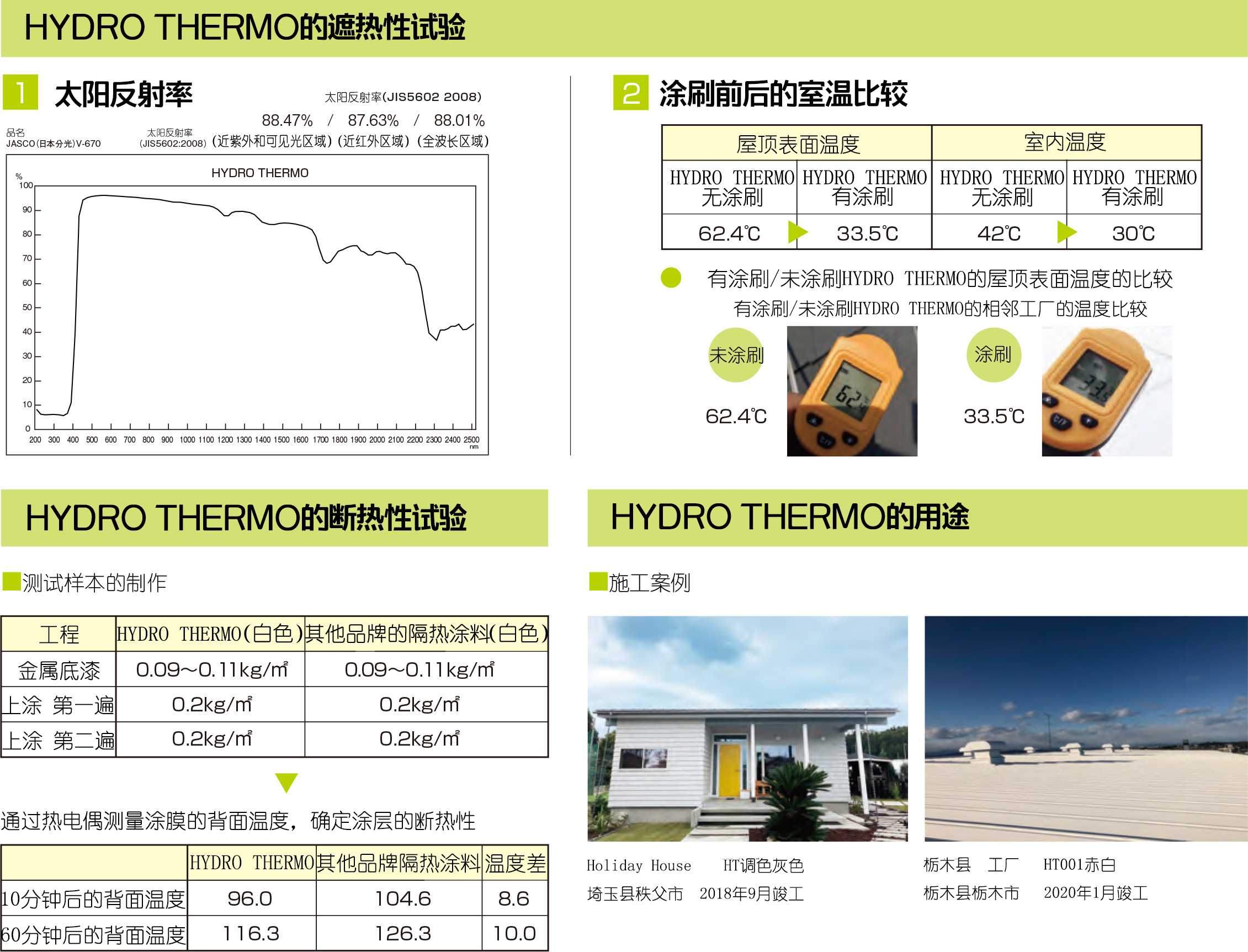 HYDRO THERMO是一种亲水性隔热涂料,可以保护地球环境。基础树脂中含有丙烯酸和硅,高耐候性。通过混合特殊颜料,可以有效反射阳光中的红外区域(波长380nm~2500nm),从而抑制表面温度的升高。由于具备亲水性功能,可以通过雨水提供自清洁效果,由此污垢不易附着,可以长期保持隔热效果。