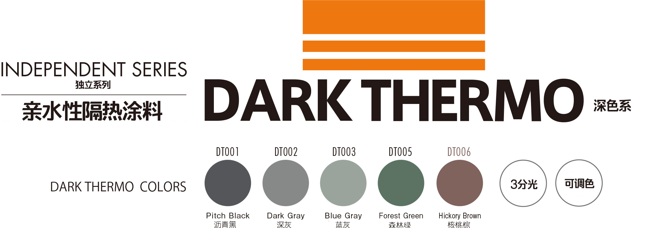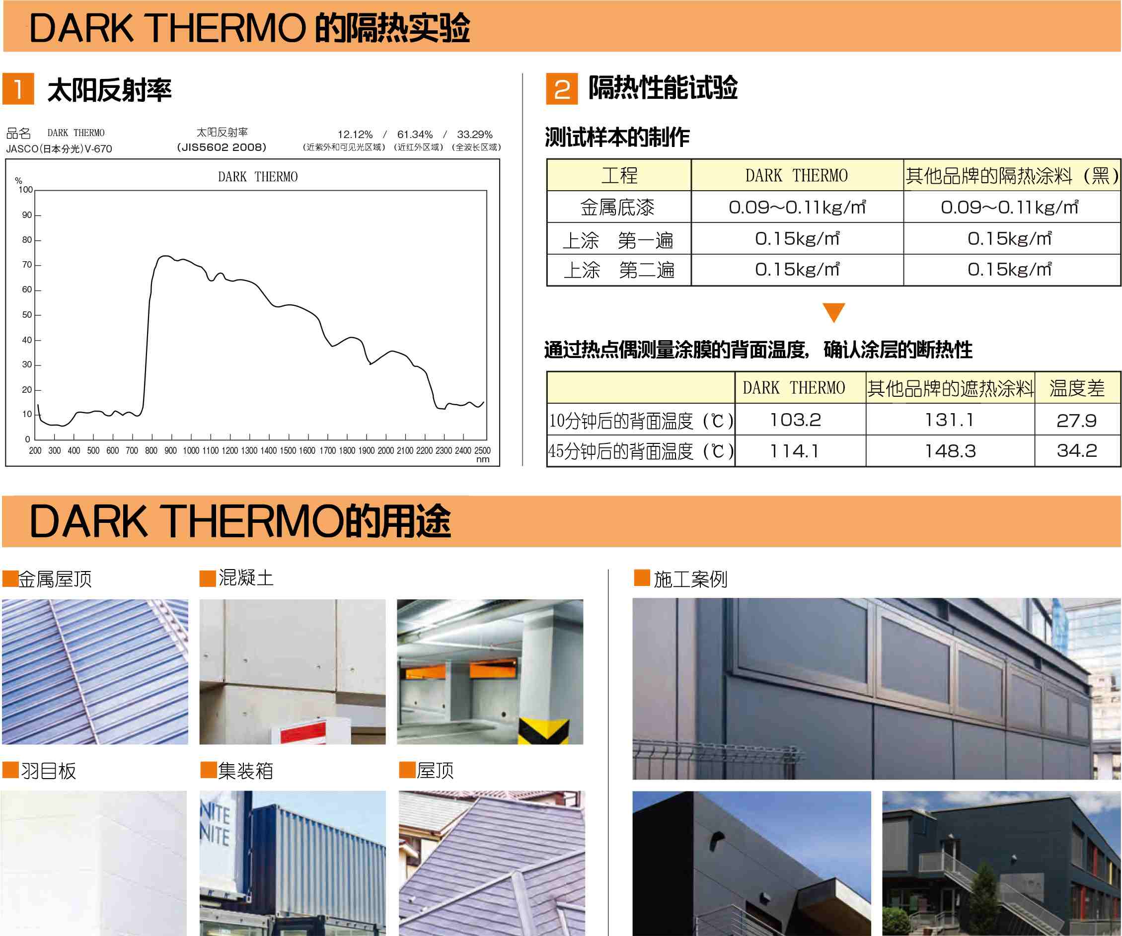 DARK THERMO含有一种特殊的红外线透射颜料,以改善传统隔热涂料难以实现的深色的红外线反射功能。通过这种技术,白色自不必说,从浅色系到深色系,涂料本身即具备隔热功能,涂刷后有助于抑制城市热岛效应,减少温室气体排放并降低能耗。DARK THERMO的另一个特点是,结合亲水性功能,可以长时间保持其隔热效果。
